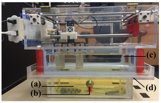 Physical Layout. For the test-bed, the antenna set needs to be moved in a predefined 2D path to collect the data over a horizontal plane. To achieve this purpose, a belt-driven mechanical layout was designed based on the open source 3D printer MAKERBOT Replicator. In this simple configuration, two stepper motors were mounted; one in a stationary position, and the other one on two steel bars, equipped with linear bearings, to make the planar motion possible. The fixed motor moved a secondary structure on the Y axis, including the other motor and the antenna set. The sliding motor moved the antennas on the X axis. The size and geometric qualities of the box containing all the mechanical parts were mainly restricted by General Electric DBT’s large compression paddle dimensions. Given these dimensions, two acrylic boxes were simply built, one on the top, holding the described XY actuator, and one on the bottom, serving as a liquid container. The bottom part was to fit into the paddle, and stand directly over the compressed breast area (Figure 6a–d).