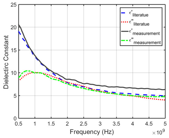 Dielectric properties of ethanol (200 proof) in the 0.5–5 GHz range; measured versus what has been reported in the literature [125]. and denote the real and imaginary part of the complex relative permittivity, respectively.