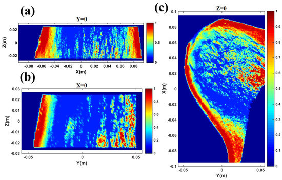 ANSYS HFSS was employed to study the SAR of the heat induced by an AVA inside a breast model placed under the antenna. The model constituted the data of fat distribution inside a real, healthy breast whose image was obtained by the DBT at the MGH. Figure 11 shows the fat distribution in the breast model from different views. The maximum value of 1 in the color bar shows 100% fat composition.