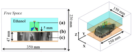 The original model of the breast contained a large data matrix, so instead of importing the whole data set into HFSS, the fat ratio values were averaged in cubes of 6-mm sides and imported as a new object in the software, thus reducing the computational load. Note that the discretization for the full-wave simulation was still kept at one tenth of a wavelength inside each cube. Then, the complex dielectric properties of the breast were approximated with a Cole-to-Cole model. The effect of the compression paddle and ethanol container were also taken into account by setting up a simplified geometry of the real system as shown in Figure 12. In the real system, the input power by the PNA was 0 dBm (1 mW), and thus the simulations were configured accordingly.