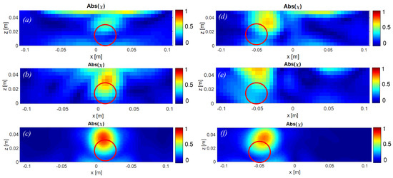 Using the approach described in Section 7, the image of the ball was reconstructed in the XZ plane at two different positions: first at 1 cm off-center and second at 5 cm off-center, in the X direction. To assess the obtained results, the same geometry was also configured in MATLAB for both cases, and the problem was solved for the unknown variable using the Finite Differences in the Frequency Domain (FDFD) method. Figure 14 illustrates the results both from the simulations and the measurements. The measurements are carried out by both regular (a, d) and phase-stable (b, e) cables.