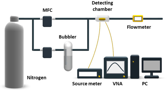 Illustration of the experimental setup for the detection of freons at P/P0 from 0.1 to 0.6 with both silicon nanoribbon field effect transistor (Si-NR FET) and thin film bulk acoustic resonator (FBAR) sensors. MFC: mass flow controller; VNA: vector network analyzer; PC: personal computer.