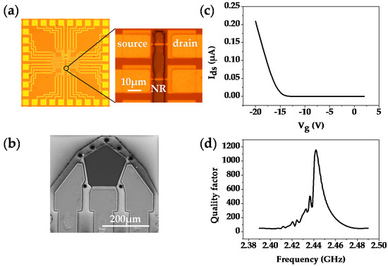 Illustration of the dual-mode gas sensor. (a,b) present the optical microscope images of the Si-NR FET array and the scanning electron microscopy (SEM) image of an FBAR configuration; (c) and (d) describe the Ids-Vg characteristic of the Si-NR FET sensor and the quality-factor curve of the FBAR sensor.