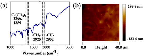 (a) FTIR spectroscopy result and (b) AFM image of the PIB layer coated on the FBAR sensor.