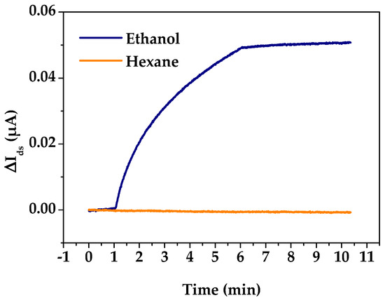Real-time responses of a Si-NR FET device to ethanol and hexane at P/P0 = 0.1.