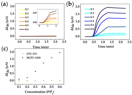 Figure 7a,b show the real-time responses of the Si-NR FET sensor to CFC-113 and HCFC-141b vapors at different concentrations. The y-axis scale is kept the same between the two figures for comparison. It can be seen that the measured current (Ids) significantly increases once the sensor is exposed to HCFC-141b, while for CFC-113 the current keeps nearly constant during the entire sampling period. As discussed previously, the poor response of the Si-NR FET sensor to CFC-113 can be attributed to the weak polarity of the analyte. In contrast, a stronger polarity of HCFC-141b results in a much more obvious response from the Si-NR FET sensor (Figure 7c). These results suggest that CFC-113 and HCFC-141b can be effectively distinguished with the Si-NR FET sensor.