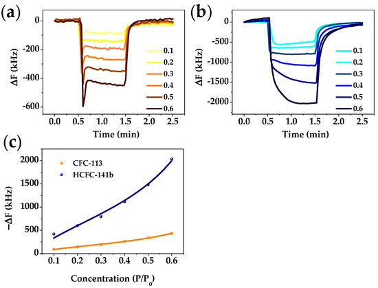 In order to obtain quantitative concentration information for freons regardless of polarity, we applied a PIB-coated FBAR for CFC-113 and HCFC-141b detection. Figure 8a,b respectively show the real-time responses of FBAR to CFC-113 and HCFC-141b vapor from P/P0 = 0.1 to 0.6. As can be seen from comparing the figures, HCFC-141b shows larger frequency shifts than CFC-113. To further understand this phenomena, we investigated the adsorption isotherms by fitting data with the Brunauer–Emmett–Teller (BET) equation [50], a typical model of multilayer gas physisorptions: