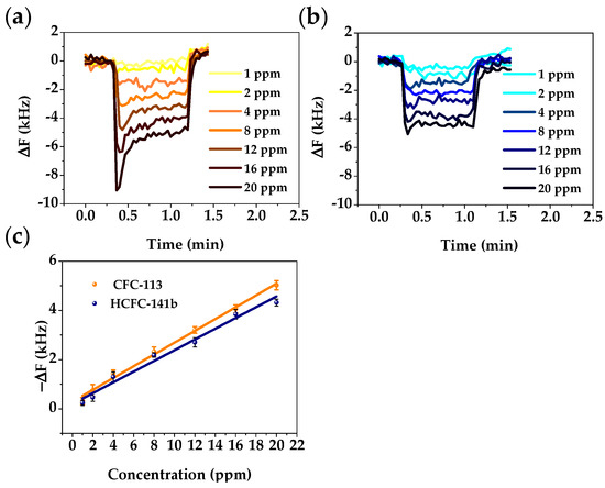 To investigate the LOD of this method, the same sensor was used to detect a lower concentration range of CFC-113 and HCFC-141b (here we used the ppm horizontal axis instead of P/P0). Figure 9a,b respectively show the real-time responses of the FBAR sensor to CFC-113 and HCFC-141b vapors at 1 to 20 ppm. It is clear that the relationship between concentration and frequency change is linear within this concentration range (Figure 9c). This linearity is caused by the unsaturated adsorption of freons in the PIB polymer, and thus this adsorption can be modeled as monolayer adsorption. Owing to the high adsorption capacity of the polymer coating and high operation frequency of the device, the detection limit, typically calculated as three times the baseline noise level response, is estimated to be around 4 ppm.