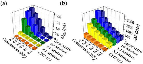 Freons mixtures detection by the dual-mode gas sensor. Three-dimensional bar plot of (a) current responses of the Si-NR FET sensor and (b) frequency responses of the FBAR sensor to CFC-113, HCFC-141b, and their three mixtures at different concentration ranges.