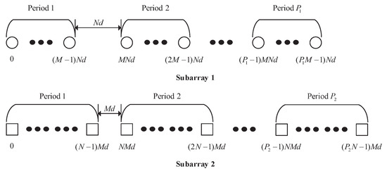 Firstly, we have a quick review of the CAMpS. As shown in Figure 1, the CAMpS, which is the multiperiod extension of the prototype coprime array, consists of two uniform linear subarrays. Subarray 1 contains sensors with the intersensor spacing of N units, and Subarray 2 contains sensors with the intersensor spacing of M units. We use d to denote the unit interelement spacing. Then, the sensors of the CAMpS are located at , where and . Due to M and N being coprime, there are common elements between the two subarrays. Hence, the number of the elements in the CAMpS is . For convenience, in the following sections of this paper, we normalize all the locations by the unit interelement spacing d.