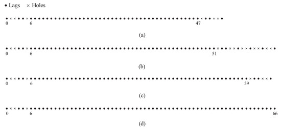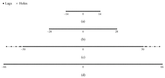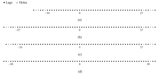 (a) Define as the cross-sum set between and . Firstly, we would show that contains all the consecutive lags in the range . Given an arbitrary integer x in the above range, we need to demonstrate there exist and such that . According to [22], we know that there exist and , which can vary over all the integers, such that . Then, we can further have , where y is an arbitrary integer. Denoting and , we can choose the value of y to make satisfy . Thus, we obtain , that is, . This demonstrates contains all the consecutive lags in the range . Then, it is obvious that the consecutive range of the cross-sum set between and is . When , the length of the consecutive range is greater than . Thus, the cross-sum set between and contains all the consecutive lags in the range .