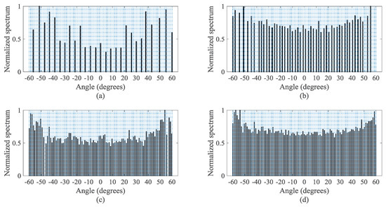 Spatial spectra of the uniformly distributed signals detected by the four virtual configurations ( and SNR = 10 dB): (a) the ULA with the NC MUSIC used; (b) the ULA with the VNCM used; (c) the CAMpS with the VNCM used; and (d) the DsCAMpS with the VNCM used.