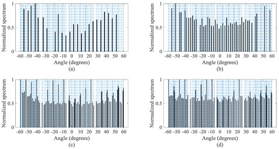 In order to demonstrate the estimated DOAs when the signal source distribution changes, in Figure 8, we further simulate the normalized MUSIC spectra of the non-uniformly distributed signals detected by the four virtual configurations. Here, sources are non-uniformly distributed between and , and the other parameters are the same as those in Figure 7. The non-uniform distribution of sources could make some DOAs get very close, which may deteriorate the DOA estimation performance. However, Figure 8d shows that the DsCAMpS with the VNCM used can still detect all the sources. In contrast, the other three virtual configurations fail to obtain the correct DOA estimations, which is shown in Figure 8a–c. Thus, regardless of whether the signal sources are uniformly distributed or non-uniformly distributed, the DsCAMpS with the VNCM used achieves a better performance than the other three virtual arrays.