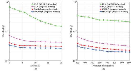 where J is the number of Monte Carlo simulations, denotes the real DOA of the qth signal source and denotes the estimate of for the jth trial, . In all the simulations, we consider the signal source number and utilize 500 independent Monte Carlo simulations. Figure 9a depicts the RMSE performance as a function of the input SNR. In this simulation, we suppose . It is clear that all the arrays with the VNCM used outperform the ULA with the NC MUSIC used due to the diff–sum coarray containing more consecutive elements than the traditional NC virtual array. Among the three arrays with the VNCM used, the DsCAMpS achieves the best performance. In Figure 9b, we suppose SNR = 10 dB to compare the RMSE performance as a function of the snapshots. Here, we consider . From the results, all the arrays with the VNCM used still perform much better than the ULA with the NC MUSIC used. Compared with the RMSE of the ULA and the CAMpS with the VNCM used, the RMSE of the DsCAMpS with the VNCM used is smaller. The results of the two simulations suggest that the diff–sum coarray achieves a higher number of DOF than the traditional NC virtual array and the DsCAMpS is a novel array of which the diff–sum coarray has higher DOF than that of the ULA and the CAMpS.