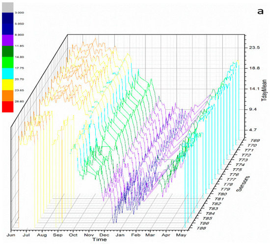 In order to understand the thermo-hygrometric behavior during the year, Multi-Curve plots for the daily mean temperature (Tdaym) and RH (RHdaym) are represented for each sensor (Figure 3). In general, Tdaym remains stable between July and at the end of October (26.6–20.7 °C). The higher amplitude is present during the winter season (17.7–3 °C, Figure 3a). Regarding RHdaym, it remains stable along the entire monitoring campaign with values between 99–84% (Figure 3b). Note that during the autumn-winter, the RH values are closed to saturation (97–99%) (Figure 3b).