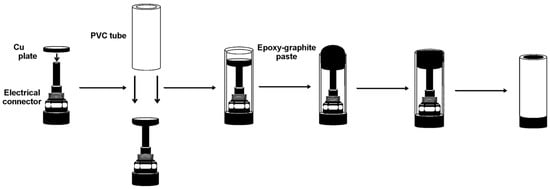 The construction of the electrodes was carried out using PVC tube body (6 mm i.d.) and a small copper disk was soldered at the end of an electrical connector. The next step of the procedure is to prepare the graphite-epoxy composite mixture. This mixture was prepared by hand mixing of the epoxy resin, the hardener and the graphite powder [21,22]. The resulting paste was homogenized by mixing for 1 h and then it was cured at 40 °C during 2 d. Before each use, the electrode surface was moistened with MilliQ water and then thoroughly smoothed with abrasive sandpaper and finally with alumina paper (polishing strips 301044-001, Thermo Scientific Orion, Waltham, MA, USA) in order to obtain a reproducible electrochemical surface.