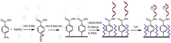 Steps for the experimental protocol for the label-free aptasensor for Lys detection based on covalent bond immobilization technique via electrochemical grafting.