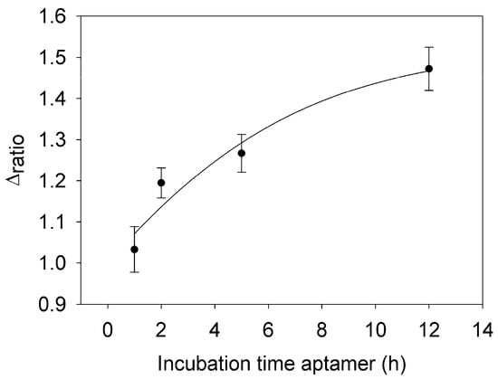 This section was developed in order to optimize the immobilization time of aptamer employed. For this, four different incubation times such as 1.0 h, 2.0 h, 5 h and 12 h were evaluated. The concentrations of the aptamer and the blocking agent used were 1 μM and 40 mM, respectively. As it shows Figure 4, the minimum incubation time of the aptamer that can be used is 2 h, due to the Δratio begins to increase. Less than 2 h is not a good immobilization time of the aptamer onto the surface of the electrode, as the Δratio values are close to 1. For that reason and for practical use, the best option considered was 12 h. In this time, high Δratio values were obtained and also with proper reproducibility.