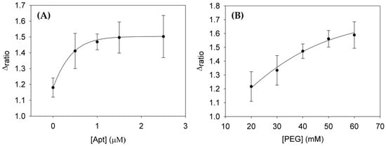 (A) Optimization of the concentration of AptLys; (B) Optimization of the concentration of the blocking agent, PEG. Uncertainly values corresponding to replicated experiments (n = 5).
