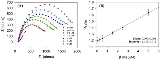 The analytical performance of the aptasensor was evaluated with different concentrations of Lys. For this, the concentration of Lys employed were 0.25, 0.5, 1.5, 2.5 and 5 μM. The concentrations of aptamer and PEG employed were 1 μM and 50 mM, respectively. The aptamer strand recognizes the protein through a three-dimensional folding following host-guest principles. The results obtained in this experiment are shown in Figure 6A. In this representation, it can be seen that the charge-transfer resistance Rct increased in each step of the procedure. This is due to the effect on the kinetics of the electron transfer reaction by the redox probe, which is delayed at the interface of the electrode, mainly caused by steric hindrance and electrostatic repulsion presented by the complex aptamer-protein formed [26]. This is an additional advantage of using EIS as the transduction principle: each step in the biosensing protocol can be assessed, thus confirming the procedure is correctly performed. On the other hand, when the concentration of Lys increases the Rct also increases. To evaluate the detection limit (LOD), sensitivity and the lineal response range, a calibration curve was built. In this calibration curve (Figure 6B) the analytical signal (Δratio) is plotted versus the concentration of Lys. In a first instance, it is deduced that there is a correct recognition of the protein by the aptamer. This fact is observed when the concentration of Lys increases because, R2, the interfacial electron transfer resistance between the electrode surface and solution increases as well. The linear relationship (R = 0.999) between the Δratio and the concentration of Lys is according to the equation: Δratio = 0.090 [Lys] + 1.182. All the measurements were performed with n = 5 replicates. The detection limit, 1.67 μM, was estimated as 3.3 times the standard deviation (n = 5) of the lowest stock concentration (0.25 μM) and the sensitivity (0.090 μM−1) is the slope of the calibration curve, all these in label-free conditions. In addition, it was obtained a calibration curve with a linear range from 1.67 μM to 5 μM of Lys. However, Figure 6B shows perceptible signal below the LOD, because it was calculated using the standard deviation of the lowest stock concentration, what increase noticeable the LOD.