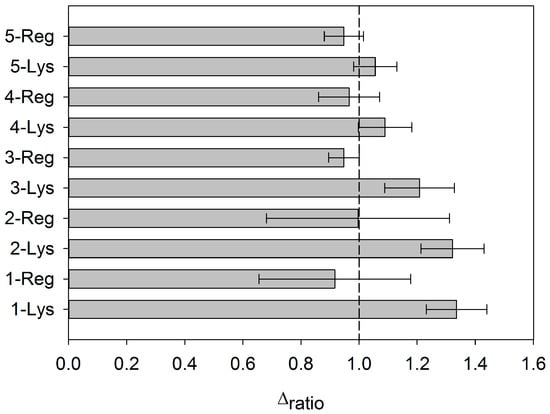 Δratio values for five consecutive cycles of regeneration. The concentration of Lys employed is 2 μM. The deviation is calculated for n = 5 replicates.
