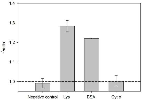 An efficient electrochemical aptasensor has to display good specificity. The influences of interferences can be estimated from the value of the delta ratio of assays in their presence. In order to verify that the aptasensor developed is specific for the detection of Lys different experiments were performed. The proteins analyzed were Lys, Cyt c and BSA, essentially because they were common proteins and available in the laboratory. The procedure was carried in the same manner as above but changing the protein in the last step of the protocol. The concentration of the protein used in these selectivity assays was 0.5 μM. The concentrations of aptamer and PEG used were those optimized in the previous sections. The results are shown in Figure 8. As it is observed there, Cyt c is not detected by the aptasensor. Alternatively, in the case of BSA, the interfering effect is more significant. It is important to highlight that the interference given by proteins depends of the blocking agent used, as it is originated on the non-specific adsorption of the former. In our protocol, the employed blocking agent was PEG, normally considered a weak blocking agent. In the literature, many researchers reported the use of stronger blocking agents such as casein or BSA. One possible solution to improve the assay and overcome the BSA interference would be to use a stronger blocking agent such as the same BSA or casein, which would occupy the adsorption points. This alternative would be necessary only if a very complex sample matrix were used. To conclude, a negative control was also evaluated with the aim of verifying that the protocol operates properly. This negative control was made with deionized water and it demonstrated that the procedure provided consistent results.