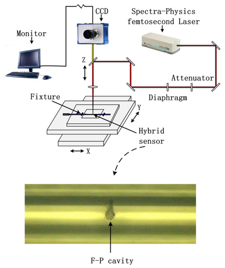 As shown in Figure 2, the inline FFPI and type-II FBG were both fabricated by a fs laser 3D micromachining system which was composed of four parts, a fs laser (Spectra-Physics Inc., Santa Clara, CA, USA), external optical path, CCD monitoring system (SigamaKoki Inc., Tokyo, Japan) and 3D working platform (Newport Inc., Franklin, MA, USA). The single-mode fiber (SMF) was fused silica HIPOSH® fiber (YOFC Ltd., Wuhan, China, with core/cladding of 9 µm/125 µm). The pulse width and repetition rate of the fs laser were 120 fs and 1 kHz, respectively. The 3D working platform had a movement range of ±100 ±100 ±25 mm (in the X,Y,Z directions, respectively) and the movement accuracy was 1 μm. The pulse energy was controlled by a tunable attenuator. The FBG inscription by the fs laser is a nonlinear and multiphotonic process for optical fibers [16]. The spectra of type-II FBGs was measured by using a supercontinuum source (YSL Photonics Inc., Wuhan, China) with an output wavelength range from 1100 nm to 1600 nm and an optical spectrum analyzer (OSA) (Yokogawa Inc., Tokyo, Japan) with resolution of 0.02 nm. Figure 3 shows that the type-II FBG had three high reflectivity resonances in the wavelength range from 1100 to 1600 nm. The FWHM of the FBG for all three orders (1.1 μm, 1.3 μm 1.5 μm) were 2.58 nm, 1.82 nm, and 0.84 nm, respectively. The pulses used for type-II FBG inscription were 3 mm radius, with 0.6 mJ pulse energy at 1000 Hz repetition rate. The average light power intensity in the focal line was about 1013 W/cm2. The pulses used for FFPI ablation were 3 mm radius, with 0.8 mJ pulse energy at 100 Hz repetition rate. The laser focusing mode has also been changed from line mode to point mode.