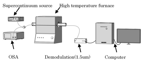 The wavelength shift of resonance in 1.3 μm of type-II FBG was recorded by an OSA (Yokogawa Inc.). The supercontinuum source and OSA were connected to the two input ports of a 3 dB fiber coupler respectively. One end of the hybrid sensor in the furnace tube was connected to the output port of the coupler and the other end of the hybrid sensor was connected to a self-manufactured OSD (Bayspec Inc.). The temperature started from 30 to 50 °C, then rose to 1100 °C with a step of 50 °C and the speed of 10 °C/min. In each setting temperature point, the temperature was holding 20 min to ensure the heat exchange and eliminated the influence of the temperature fluctuation.