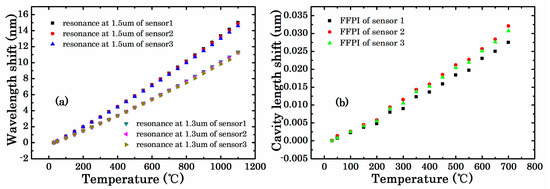 The high temperature response of the type-II FBG and FFPI are plotted in Figure 6, respectively. The results showed that shift in Bragg wavelengths was nonlinear from 30 to 1100 °C, and the cavity length change was also nonlinear from 30 to 700 °C. The data at the temperature of 30 °C was defined as the initial values. The initial values of type-II FBGs were (1543.6734 nm, 1325.56 nm), (1543.3413 nm, 1325.272 nm), and (1543.8212 nm, 1325.691 nm), respectively. Also the initial cavity lengths of FFPI were 63.3994 μm, 71.3354 μm, and 69.1103 μm, respectively. The test temperature was holding 4 h at 1100 °C and the reflection spectra of the three type-II FBGs did not change throughout the testing process. The peak intensity of the three FFPI data was declined from nearly −53 dBm to −70 dBm when the temperature exceeds 700 °C. The OSD was unable to complete the peak search. The FFPI cavity data could hardly keep stable and fluctuated within a dozen microns. This phenomenon could be attributed to the uneven surface of the FP micro-cavity that led to an irregular expansion at such high temperatures, leading to larger intensity loss.