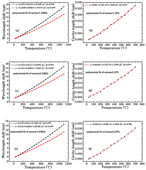 In previous studies [5,8], theoretical research showed that the wavelength shift of type-II FBGs was mainly determined by the elastic coefficient, thermal expansion coefficient (CTE) and thermo-optical coefficient (TOC). However, the correlation coefficients of silica-based FBGs would no longer be constant at high temperatures, and the known sensing parameters were no longer viable in this situation. Meanwhile, calibration of FBG sensors at high temperatures before any measurements remains an unsolved problem.
