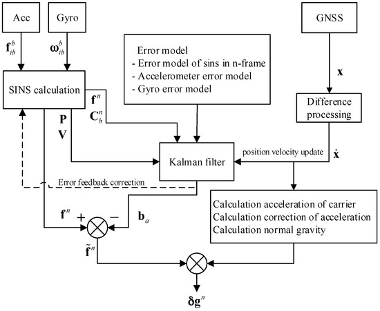 The purpose of gravimetry is to extract the mGal (10−5 m/s2) level gravity disturbance from the G (9.8 m/s2) level origin measurement data, which means the signal-to-noise ratio is very small. The purpose of gravimetry is to recover gravity disturbances with an accuracy of the order of 1 mGal () from a signal of the order of mGal, i.e. with an extremely small signal-to-noise ratio. The flow chart of strapdown airborne gravimeter data processing is shown in Figure 1 [9]. The strapdown airborne gravimeter can be regarded as a multiple inputs single output control system. The inputs of this control system are from inertial sensors and GPS, whereas the output is the gravity disturbance. As a control system, the strapdown airborne gravimeter also has a limited measurement ability and is related to the noise level of the system inputs.