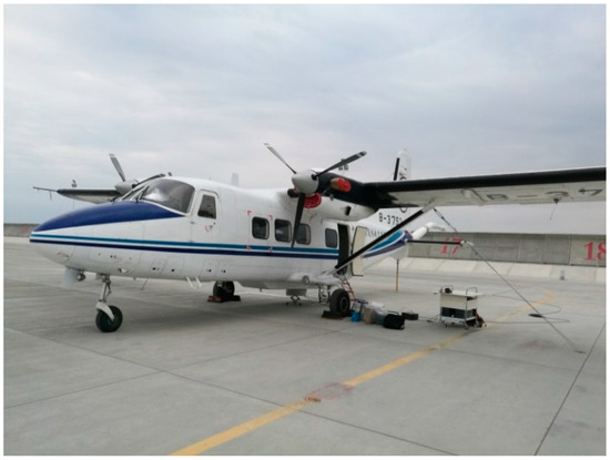 The gravimetry system was mounted on a Y-12 aircraft, which was a fixed-wing aircraft without an autopilot. The detail characters of flight were shown in Table 2. The Y-12 is shown in Figure 3. The survey area was about 1600 km2, in which the longitude range was 0.5° and the latitude range was about 0.33°. Each survey line was about 40 km, whose ends were extended 5 km to eliminate the boundary effect of low-pass filter. In this regional airborne gravimetry task, the maximum distance between survey area and airport was less than 140 km. The flight path from airport to survey area was fixed to collect repeat line data, which could be called quality assessment line. Figure 4 is the path of certain flight and path of quality assessment line is red highlight.