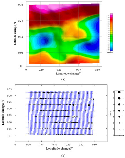 (a) Gravity disturbance in the survey area after adjustment; (b) Cross-point differences in the survey area after adjustment.
