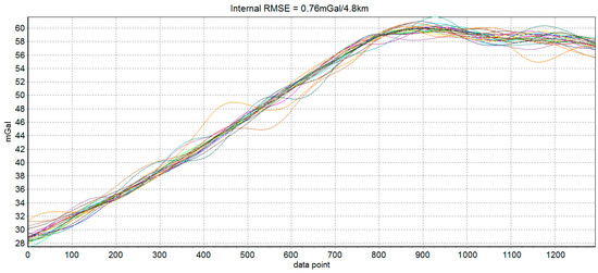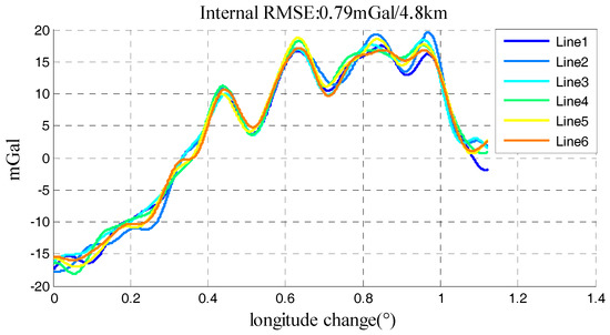 The standard deviation of four factors, internal RMSE and quality assessment results in Neimeng flight were shown in Table 7. Quality assessment results of 6 lines in Neimeng flight were shown in Figure 16. The standard deviation of residuals was 0.17 mGal and the largest estimation error was 0.45 mGal in Figure 16. The quality assessment result is still an exacting index for quality assessment. The Neimeng flight’s quality assessment results show the performance of established model when applying in different survey. Compared four determinants in Table 4 and Table 7, the stability of flight in Neimeng is worse than that in Xinjiang. As a result, the performance of SGA-WZ02 in Xinjiang is better than that in Neimeng, which could be seen from the quality assessment results and internal RMSE.
