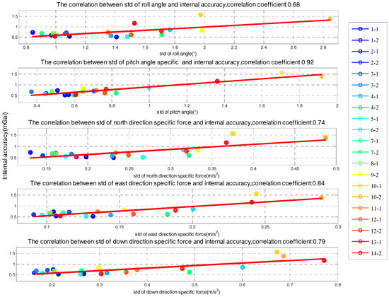 The use of cross point internal RMSE could evaluate the truly accuracy of system and the total survey quality. However, as mentioned, cross point internal RMSE needs extra flight and more extra flights mean more comprehensive evaluation. When the cross points are not available, how to assess the single line quality should be considered, which means the quality assessment method is quite needed. Let assume that such a situation, the survey lines were added outside the arranged area where cross-over points were unavailable. Under above conditions, the single line quality assessment method is the proper way to assess the new lines’ quality. In addition, single line quality assessment method is also helpful in the airborne gravimetry quality control. In the next section, the relationships between quality assessment determinants and internal RMSE in this regional airborne gravimetry task were given by linear fitting. The single line quality assessment model for SGA-WZ02 was built by weighted linear fitting results. What needs to be noted is that the model was specially established for SGA-WZ02 while the method could be also generalized to other strapdown gravimeter.