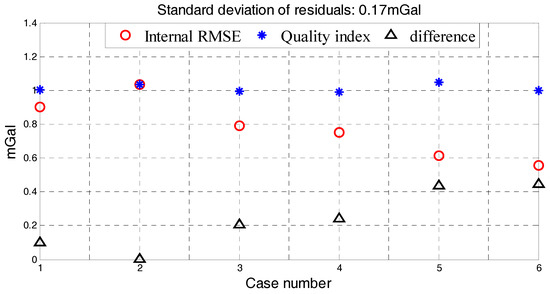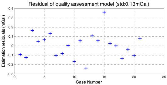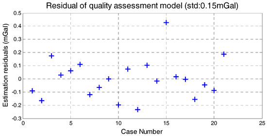 The correlation between the stability of five factors and internal RMSE is shown in Figure 7, where x-axis is the standard deviation of determinant and y-axis is internal RMSE. The red line in each subfigure is obtained by linear fitting and the correlation coefficients are also given. Correlations between the determinants’ standard deviation and internal RMSE are all significant. Thus, it is reasonable to estimate the quality of survey line through the standard of five determinants. Based on linear fitting results in Figure 7, relationship model between the five factors and internal RMSE is built by weighted method, which is shown in Equation (8). The model residuals are shown in Figure 8. We can see that quality assessment model has shown good performance and the maximum residual is 0.43 mGal in case 15.