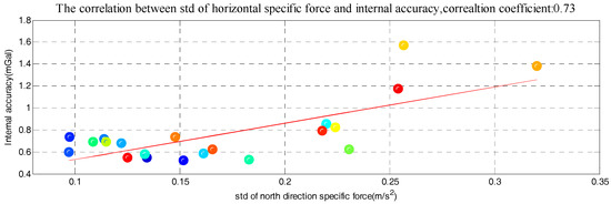 Based on the strong correlation, the assessment model in SGA-WZ02 is obtained by weighted linear fitting. After fusion the north and east specific force, the effect of flight direction is eliminated to a large extent in quality assessment. The model is specially established for SGA-WZ02 gravimeter assessing the gravimetry quality, but a similar model can also be obtained by other strapdown gravimeter during a gravimetry task if the same method is used. In the next section, data from other repeat lines will be used to testify the quality assessment model performance.