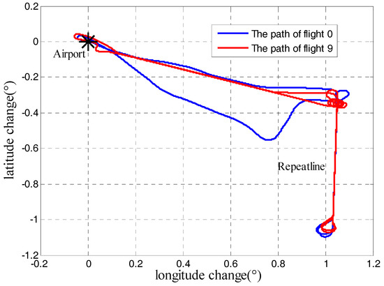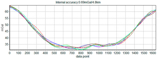 To test applicability and veracity of quality assessment model, repeat flights were used, whose flight paths are different from the highlight path shown in Figure 4. The first test flight is a repeat line flight before the survey flight 1, which is to initially inspect the gravimeter’s working performance and can be numbered flight 0. The second test flight is flight 9. There are a total of eight repeat lines and two different flight paths are shown in Figure 11. The measurement result of 8 repeat lines was shown in Figure 12. The internal RMSE is 0.69 mGal/4.8 km, so SGA-WZ02 gravimeter still shows high accuracy.