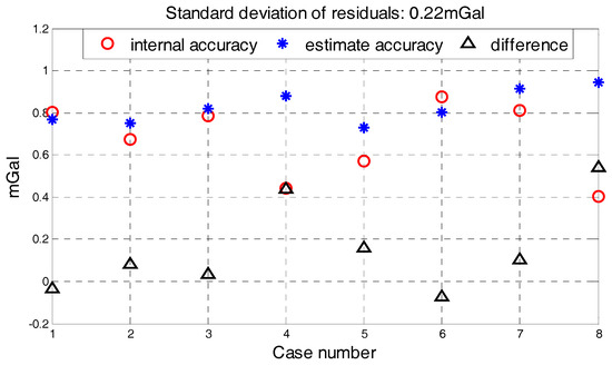 The standard deviation of four determinants and internal RMSE were shown in Table 4. Compared with the data in Table 3, four determinants in Table 4 represent the good flight stability. Using the quality assessment model shown in Equation (10) and the data from Table 4, quality assessment results of 8 lines in two flights are shown in Table 5 and differences between the quality assessment results and internal RMSE is shown in Figure 13. The standard deviation of residuals is 0.22 mGal and the largest estimation error is about 0.54 mGal in Figure 13. The good performance of quality assessment model can be seen from Table 5 and Figure 13. At the same time, the quality assessment results are larger than the internal RMSE in most cases, so we can conclude that the quality assessment result obtained by model is a conservative indicator for quality assessment. The quality requirement of this gravimetry task is superior to 1 mGal under 4.8 km resolution and the survey lines which do not meet the accuracy requirement need to be remeasured. Both quality assessment results and internal RMSE in Table 5 satisfy the accuracy requirement, which confirm the performance of quality assessment model. So, if single survey line’s quality assessment result is less than 1, it represents the result of this line satisfies the quality requirement and remeasurement does not need in a large degree. The quality assessment result obtained by the model is a complement for the classical methods during the gravimetry task.