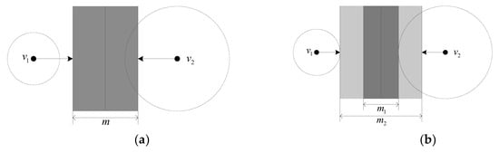 The fuzzifier m and the number of classes C are the two parameters that can be set by users in most FCM algorithms []. The fuzzy membership grades, which measure a sample that belongs to a specific clustering class, may differ depending on the value of the fuzzifier m for C, a certain classification number [,]. The cluster centers are expressed by real-number vectors, and the distance between a sample and the cluster centers is used to determine the membership grade of a sample that belongs to one class, as shown in Figure 2 The vertical line in Figure 2a can be considered a “decision” boundary, and samples are located to the left or right side of the boundary. The maximum fuzzy boundary widens when the value of the fuzzifier m increases. Therefore, once the classification number C is determined, the fuzzy membership grade of a sample that belongs to a specific class is likely to be different if the fuzzifier m takes different values [,]. The same object may exhibit a different spectrum because of influences from multiple factors. Therefore, the same spectrum in a satellite image may correspond to a different classification in the natural or real world []. In other words, the spectrum centers of geographical features usually contain uncertainty. However, classical FCM clustering algorithms cannot handle this type of uncertainty.