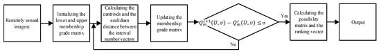 The possibility matrix can be obtained from the above equation, and its expression is as follows: P = (pij, k). Then, the ranking vector can be calculated by (n, interval numbers). Finally, the index of the maximum value in the ranking vector wk is the class index of the sample. A detailed flowchart of the improved IT2FCM* method is shown in Figure 3. Figure 3 clearly describes that the main steps of this algorithm includes essentially three steps. Firstly, just like other unsupervised algorithms, the number of image clustering types, the two fuzzifiers m1 and m2, and termination criterion value are given to initialize the minimum and maximum membership grade matrix on the basis of a random method, then all the centroids are calculated and membership grade matrix is update d []; Secondly, using the interval number ranking technique, classify each sample to a cluster according to the index of the maximum value in the ranking vector; Thirdly, report the clustering results, this step produces the best classification results based on the second step (here, although the outputs are crisp classification results, they are based on the index of the maximum value in the ranking vector and the optimal fuzzy membership value). The detailed information for these three steps is described by Table 1.