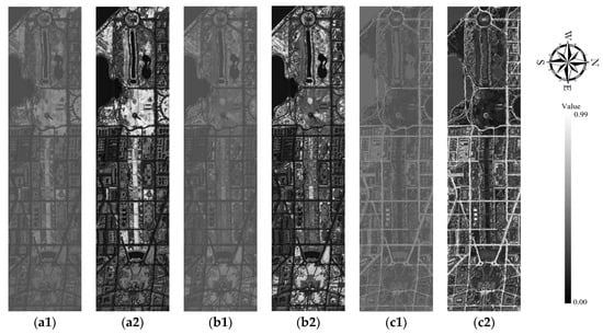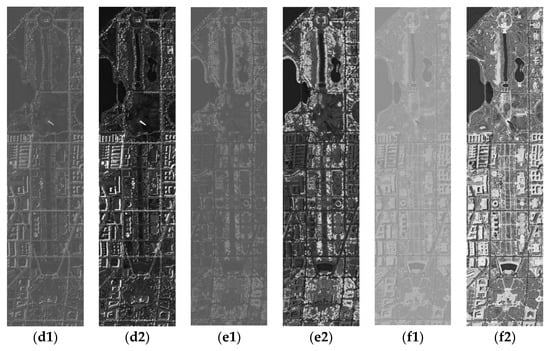 Images of membership values of different classes from IT2FCM* algorithm for a 191-band HYDICE dataset with a spatial resolution of 3 m. (a1–f2) are, respectively, the minimum and maximum membership values of sparse grass land, dense grass land, roads, shadows, trees, and bare soil and buildings.