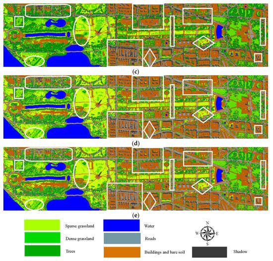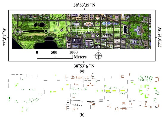 The Pavia University dataset was captured by reflective optics spectrographic imaging system (ROSIS) airborne instrument on the city of Pavia (see Figure 6a). This instrument has 115 spectral channels with spectral region covering from 0.43 to 0.86 um, and the spatial resolution is 1.3 m per pixel. Due to the impacts of noise, 12 channels have removed, and the remaining 103 bands are further processed, and atmospheric correction was done [,]. This airborne dataset covers an area of the Engineering School of Pavia University, which consists of nine different classes, including asphalt, bitumen, metal sheet, gravel, bricks, soil, shadow, meadow, and trees.