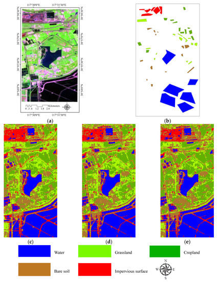 This section introduces a satellite hyperspectral remote-sensing images, Hyperion image, acquired by Hyperion instrument, board on EO-1 satellite. Considering the free cost of the dataset and easy access to downloading, the Hyperion hyperspectral image of study area of Tianjin, north China, is used. The Hyperion instrument is a high-resolution hyperspectral imager capable of resolving 242 spectral bands ranging from 0.4 to 2.5 μm with a 30 m resolution. This instrument images a 7.5 km × 100 km surface area []. During the processing of the Hyperion image, after removal of the bad spectral bands, calibration, and the atmospheric and geometric correction, about 179 bands remained. The relating algorithms for calibration and atmospheric and geometric correction are provided in [,]. From the 179-band image, a further reduced set of ‘stable’ bands could be selected for further analysis. The basis for selection of these ‘stable’ Hyperion bands and the set of stable bands are provided by []. Figure 7a shows the study area. The main land cover of this study area includes water, grassland, cropland, bare soil, and impervious surface. To evaluate the accuracy of the classification results, the ground truth data was collected (see Figure 7b).