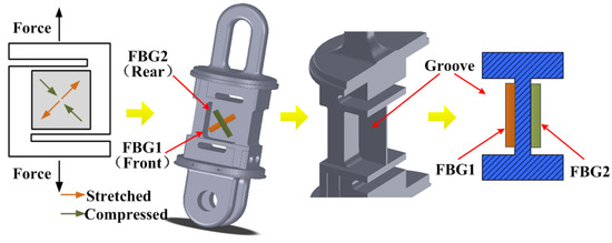 Two fiber Bragg grating strain gauges, which are packaged in the metallic materials, are mounted on the different grooves with the direction deviation of 90° from each other to eliminate the temperature effect and improve the accuracy. The metal substrate of the fiber grating strain gauge is welded to the elastic element to solve the problem of poor strain transfer effect caused by the traditional strain adhesive. Moreover, it also improves the long-term stability.