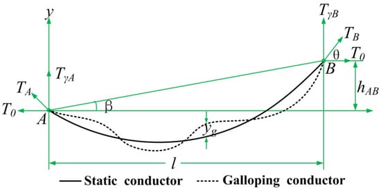 With the tension measured by the optical sensor, we can obtain frequencies, modes and amplitudes of galloping conductors. Many scholars have established the relationship between wire dancing and dynamic tension change in the form of theoretical deductions. The line length method is the most commonly accepted method used to derive the dynamic tension change of the transmission line caused by the galloping dancing [28,29]. As illustrated in Figure 3, the shape of the static conductor is shown as the solid line and l is the length of the conductor in span (m), the hAB is the high difference of the two conductor hanging point (m) and β is the horizontal angle of the two conductor hanging point (°). Then, TA, TB denote the axial tension at the suspension point of the conductor respectively (N), which is along the direction of the insulator string. TγA, TγB are the vertical tension components at the suspension point of the two ends (N) and T0 is the horizontal tension component (N).