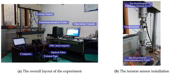 Under wind forces, phase conductors with ice may gallop. As mentioned in the Introduction, the working range requirement of the system is 0.2–3 Hz. Obviously, a static experiment is not enough to investigate the performance of the developed tension sensor in the field galloping monitoring. Therefore, the developed tension sensor was stretched at different frequencies using a high force electromechanical tester to examine the dynamic output characters. The experimental setup is shown in Figure 4.