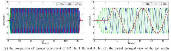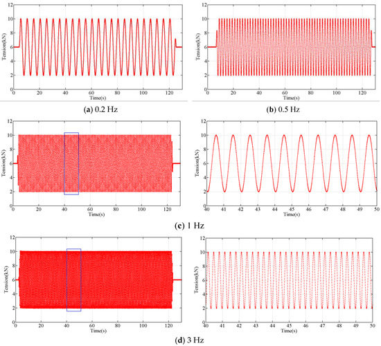 The proposed sensor was stretched in the form of sinusoidal waves at the frequencies from 0.2 Hz to 3 Hz, using the force amplitudes from 2 kN to 10 kN. The tension experiment at different single frequency lasted for 2 min. The tensions measured during the experiments at the different frequencies are shown in Figure 5 and Figure 6. The results of the experiments indicate that the output of the developed tension sensor is stable in the frequency range 0.2 Hz to 3 Hz.
