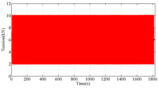 Long-term performance of the tension sensor is also important since the sensor must work in field for years. In material science, creep is the tendency of a metal to deform permanently under the influence of mechanical stresses, it indicates the long-term performance of the sensor. In the part 6.5 of standard OIML R60: 2013 “Metrological Regulation for Load Cells” [32] for electric load cells, the test time for a creep observation is 30 min. Thus, the developed tension sensor was mounted on a fatigue testing machine and stretched continuously for 30 min (1 Hz, 1800 times) for the purpose of observing whether the sensor output would change. The output tension curve of the sensor during the fatigue experiment is shown in Figure 7, and there is no shift in the measuring range.