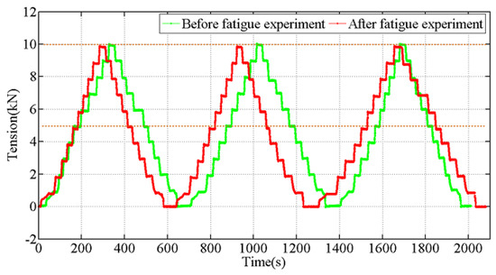 Two tension step experiments were carried out before and after the fatigue test separately. For the test, the interval times between different steps were not the same. As shown in Figure 8, the results of the experiments indicate that accuracy of the designed tension sensor is not affected by fatigue tension cycles.